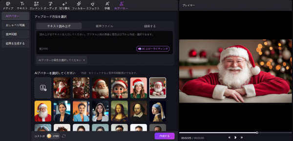 AIアバター機能を活用して、会話するサンタクロース動画を簡単に作成!クリスマスのプロモーションやサプライズに最適です。