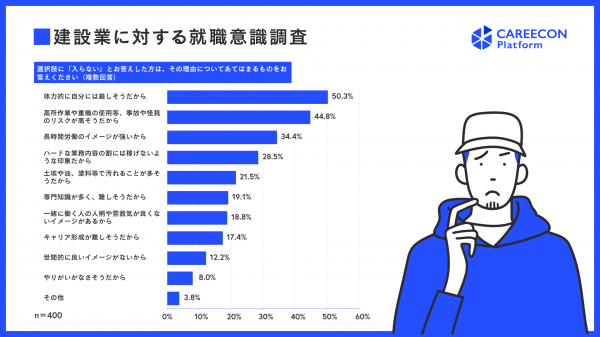 調査では、若年層が業界を敬遠する主な理由として「体力的に厳しそうだから」(50.3%)、「事故や怪我のリスクが高そうだから」(44.8%)、「長時間労働のイメージが強いから」(34.4%)がTOP3に入り、労働環境への不安が懸念されています。