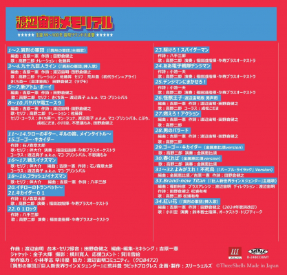 スリーシェルズは、渡辺宙明生誕99年記念CDとして「渡辺宙明メモリアル」を2024年12月25日に発売することを、12月19日に発表しました。オーディオドラマ風の構成で、生誕99年ライブや、伴大介、高野二郎の歌唱など、様々な時空が交差するというコンセプトで作られたCDです。CD企画を推進した、作詩の田野倉健之は「宙明先生の99年にCDもライブもないなんてありえません。このCDでそれを実現します」と述べています。また、女優の賀川雪絵は「恐ろしきヒット曲!歌って踊る渡辺宙明!」と応援コメントを寄せています。