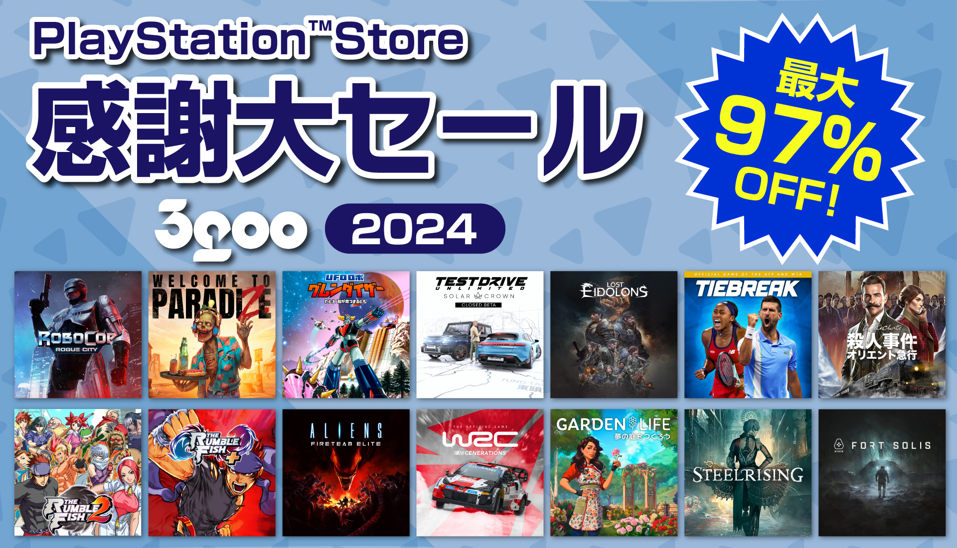 株式会社3goo(サングー)(本社:東京都渋谷区、代表取締役:ディコスタンゾ ニコラ)はニンテンドーeショップおよびPlaystation(TM)Storeにて、『アガサ・クリスティ オリエント急行殺人事件』『UFOロボ グレンダイザー:たとえ我が命つきるとも』を含む2024年に発売した新作や定番人気タイトルなど、ダウンロード版が最大98%引きとなる感謝大セールを期間限定で開催しております。