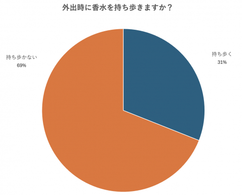 外出時の香水の携帯率についてアンケートを行ったところ、「持ち歩く」が31%「持ち歩かない」が69%と過半数が持ち歩かず外出していることが分かりました。 持ち歩かない理由としては、「つけ直すことで香りが強くなる」「荷物になる」などの意見が多く見受けられました。中には、「以前持ちあるいていた際にバッグの中にこぼした」などの体験談もありました。