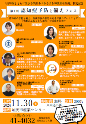上記と合わせて11月30日に「第1回認知症予防と備えフェス」を企画、開催いたしました。今回のイベントにおいては、市長による開会宣言からはじまって、医療、介護、福祉関係者のみならず、終活分野において地域の司法書士事務所、金融機関とも連携を行ったというところでは、日本でも大変に珍しい取り組みとなったと考えております。今回のイベントには終日で200名を超える方にお越しいただいたとの報告があり、加茂市における認知症条例の啓発にも繋がったことを大変に嬉しく思っております。