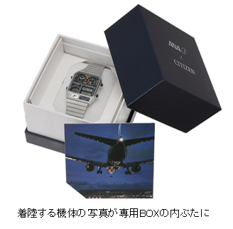 今回販売するANAオリジナルデザインのANA-DIGI TEMPは、フェイスのダイヤルや液晶を航空計器に見立て、夜の滑走路に着陸する飛行機のコックピットからの風景をイメージしました。さらに、「ANA-DIGI TEMP」にはANAロゴを配し、遊び心のある仕様に。裏ぶたにもANAロゴと飛行機機影を刻印しました。専用BOXの内ぶたには、時計のフェイスデザインと連動した夜の滑走路に着陸する飛行機の写真を入れ、箱を開けた瞬間から空の上にいるような、ワクワクする商品となっています。飛行機ファンや時計コレクターにはたまらない、限定アイテムです。