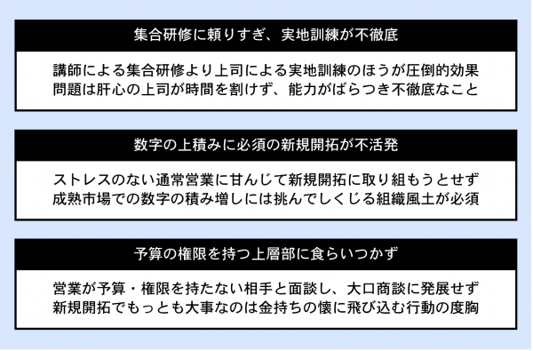 問題は肝心の上司が時間を割けず、能力がばらつき、営業指導が徹底されていないことです。