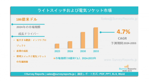 Survey Reports LLCは、2024年12月に「ライトスイッチおよび電気ソケット市場のセグメンテーション:種類別(ライトスイッチ、電気ソケット、その他)、用途別(住宅用、商業用、産業用、その他) - グローバル市場分析、動向、機会、予測、2024年~2033年」というタイトルの調査レポートを発行したと発表した。このレポートは、ライトスイッチおよび電気ソケット市場の予測評価を提供している。ライトスイッチおよび電気ソケット市場の成長促進要因、市場機会、課題、脅威など、いくつかの重要な市場力学に焦点を当てている。