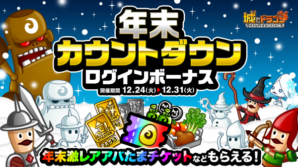 株式会社アソビズム(本社:東京都千代田区、代表取締役:大手智之)は、App Store・Google Playにて好評配信中の『城とドラゴン』で、「年末カウントダウンログインボーナス」と「年末カウントダウンミッション」を2024年12月24日(火)より開催いたします。
