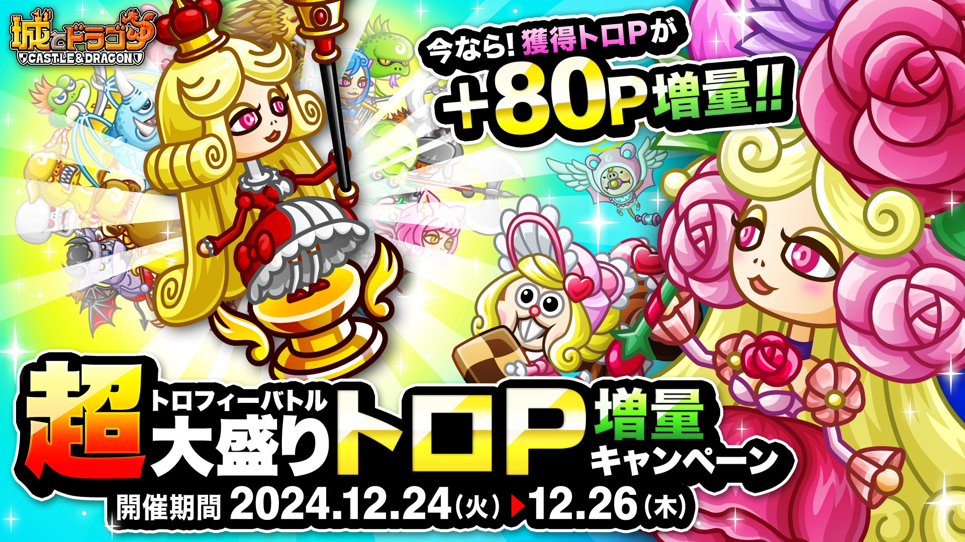 12月24日(火)19:00より、年末激レアアバたまチケットなどが入手可能な「年末カウントダウンログインボーナス」と「年末カウントダウンミッション」が開催!キャラ育成がはかどる「超!開発強化キャンペーン」や、城下町でフードやキーンをたくさん獲得できるようになる「爆速収穫キャンペーン」といったお得なキャンペーンも併催されます。また同日6:00からは「トロフィーバトル」が3日間開催中。今回は獲得できる“トロP”が通常よりも大幅に増える「超大盛りトロP増量キャンペーン」も併催しております。ポイント大量獲得のチャンスですので、ぜひバトルに参戦しましょう!