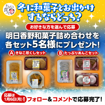 今回のキャンペーンでは、冬のお出かけに持っていきたい和菓子詰め合わせのセットを2種類から選んでいただき、各セット5名様にプレゼントいたします。
