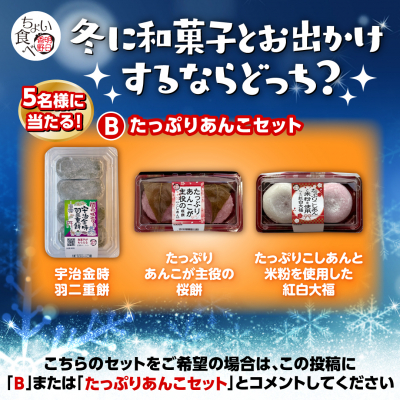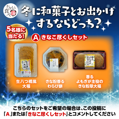 (2)キャンペーン期間中に「冬に和菓子とお出かけするならどっち?」キャンペーンの投稿を「A.きなこ尽くしセット」希望の場合はリポスト。「B.たっぷりあんこセット」希望の場合はいいね。