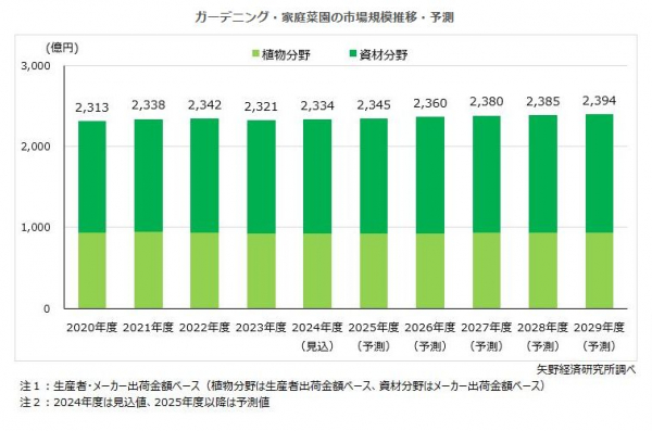 2024年度は、春先の野菜価格の高騰や食品を含む消費財全般の物価高によって、家庭菜園にも注目が集まり、初心者にも育てやすい品種や収穫してすぐに料理などに使えて便利なハーブ類等に対する需要も高まっている。このような新規顧客の獲得に向けた取組み等によって市場は微増傾向で推移し、2029年度のガーデニング・家庭菜園の市場規模は2,394億円(2023年度比103.1%)になると予測する。