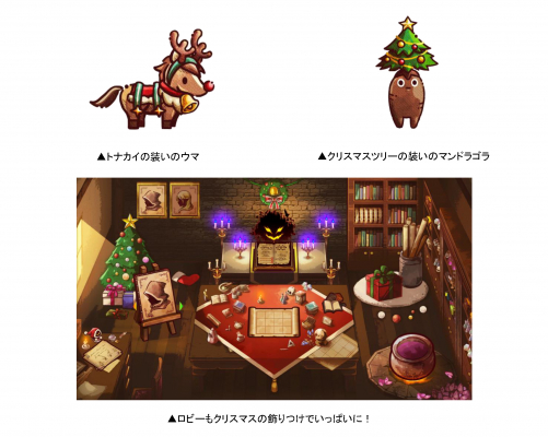 期間中、ゲームにログインするとロビーがクリスマス仕様に変更されます。さらに、ウマは「トナカイ」に、マンドラゴラが「クリスマスツリー」に大変身!この期間だけのかわいい姿をぜひ見に来てくださいね。