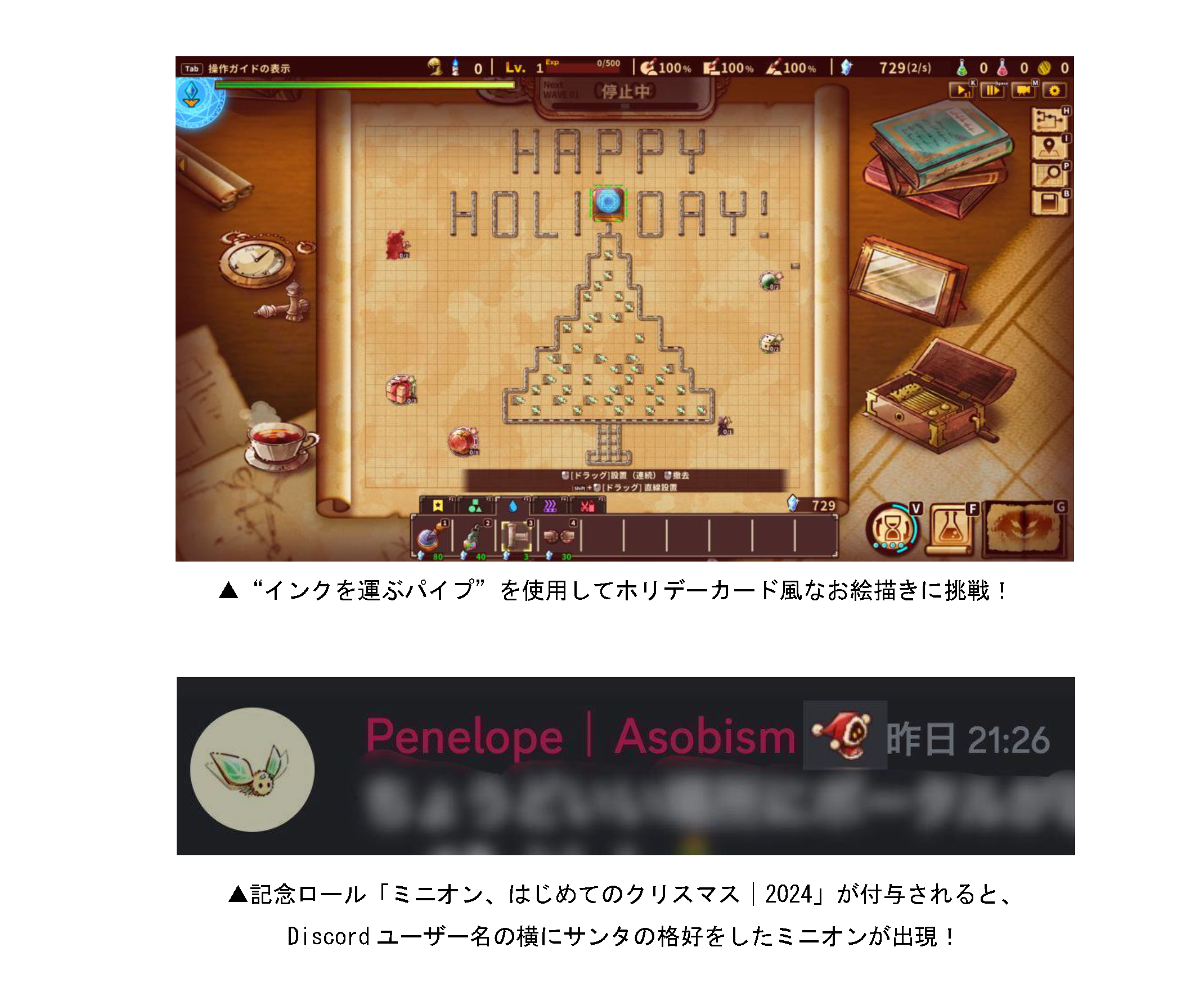 『ShapeHero Factory』公式Discordチャンネルに「パーティーチャンネル」が新しく開設されました。こちらのチャンネルでは現在、クリスマスのイベントを行っております。クリスマス仕様のヒーローが大量に運ばれてる工場やバトルフェーズの様子をはじめ、期間限定のクリスマス仕様のロビー画面や、普段はヒーローの量産のために使用する工場の設備等を使ってスクロールの上にお絵描きなど、クリスマスにまつわるスクリーンショットを撮ってこのチャンネルに投稿すると、「ミニオン、はじめてのクリスマス│2024」の記念ロールが付与されます。ぜひプレイして、クリスマスなスクリーンショットでパーティー気分を楽しみましょう!