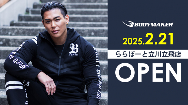 2025年2月21日(金)(予定)「BODYMAKER ららぽーと立川立飛店」が新規オープンします。BODYMAKER は、商品開発から販売まで一環して行い、お客様へ高品質・リーズナブルな価格でスポーツ用品を提供しています。直営店舗「BODYMAKER ららぽーと立川立飛店」では、格闘用品、トレーニング用品、アパレル、シューズをはじめ、人気のマシン「ホームジムDX」も販売!各種スポーツ用品を販売(予定)します。またオープンを記念して2025年2月21日(金)10時(予定)より、【ららぽーと立川立飛店 限定価格オープン記念セール】を開催いたします。先行告知として、ららぽーと立川立飛店 限定価格で販売(予定)ぜひ、ご来店くださいませ。