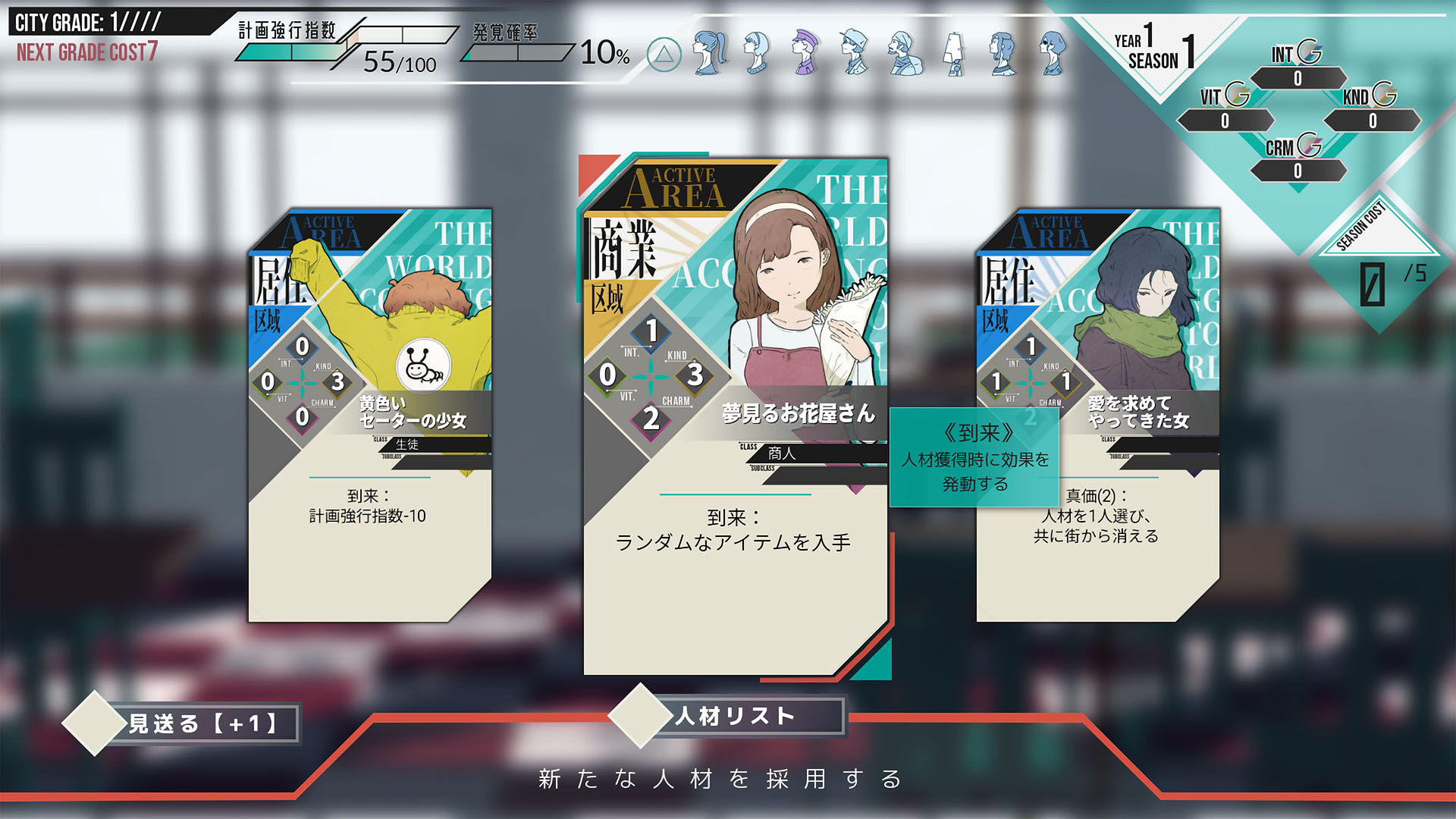 1年6シーズン(ターン)、全7年(合計42ターン)をかけて、真の救世主となる少女を育てていきます。そして、1年の終わりには少女の能力を計る「審問官」との対話(バトル)が待っています。少女の能力とそれまでに育まれた思い出を使って「計画」の続行を勝ち取っていくのです。さらに、物語の結末は少女の能力で変化します。少女の、世界の行く末を最後まで見届けてください。
