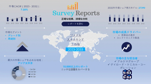Survey Reports LLCは、2024年12月に調査レポート「ジメチルスルホキシド市場はグレード別(電子、製薬、工業)、原料別(硫黄、生綿、リグニン)、用途別(除去剤とクリーナー、ポリマー加工、製薬、農薬、電子、コーティング、ファインケミカル)に区分される - ジメチルスルホキシド市場の予測評価を提供する世界市場分析、動向、機会、予測、2023-2032年」を出版したと発表した。ジメチルスルホキシド市場の成長促進要因、市場機会、課題、脅威など、いくつかの主要な市場ダイナミクスを明らかにしている。