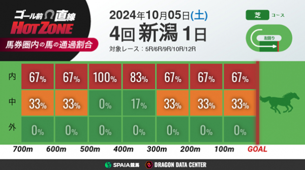 レース当日の結果をリアルタイム集計し、各馬の直線での通過経路を図表で表示。馬券圏内に入った馬の走行ルートと割合を可視化します。