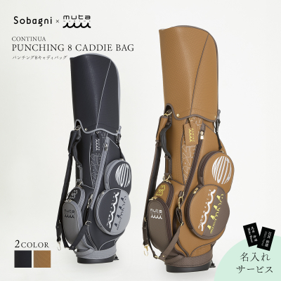 洗練された雰囲気のあるSobagniの合成皮革(エシカル素材(エシカルレザー))を使った8キャディバッグ。Sobagniの素材の最高峰の[CONTINUA]を使用し、イタリア発祥の日本ブランド muta のデザインにより生まれました。”8”をかたどったデザインが印象的なこのバッグはパンチング素材を使っているため、触感がよく深みのある印象があります。原材料にはポリカーボネート系ウレタン樹脂※を使用しており、10年以上ボロボロにならない(加水分解しない)ことが証明されています。6分割に仕切られた口枠で、スムーズな出し入れとバランスのとれたクラブ収納が可能。
