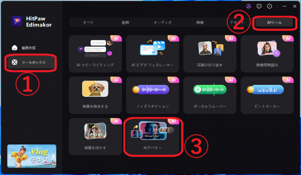 ソフトを起動し、「ツールボックス」>「AIツール」>「AIアバター」を選択。