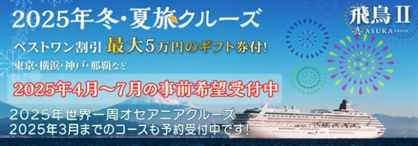 クルーズ予約サイト「ベストワンクルーズ」、「飛鳥II」の2025年7月~2025年9月出発クルーズの新スケジュールが発表されましたので、本日より事前相談、予約希望受付を開始いたします