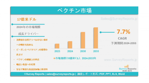 Surveyreportsの専門家は、ペクチン市場の調査を分析し、2024年のペクチン市場規模は17億米ドルに達すると予測した。さらに、ペクチン市場シェアは、2033年末までに36億米ドルの収益に達すると予測されている。ペクチン市場は、2024年から2033年の予測期間にわたって、年間平均成長率(CAGR)約7.7%で成長すると予測されている。
