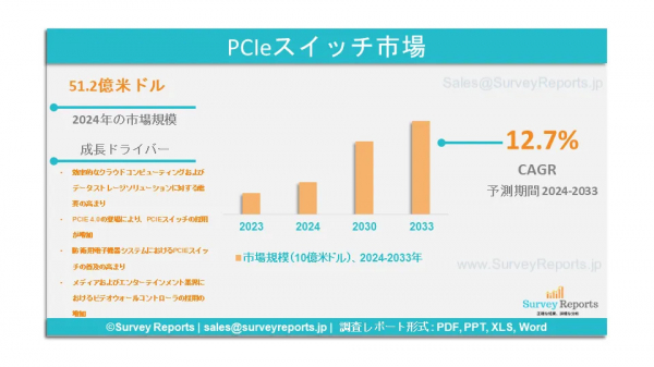 Surveyreportsの専門家はPCIEスイッチ市場の調査を分析し、2024年にPCIEスイッチ市場規模が51.2億米ドルを生み出したことを発見した。さらに、PCIEスイッチ市場のシェアは、2033年末までに168.7億米ドルに達すると予測されている。PCIEスイッチ市場は、2024年から2033年の予測期間中に、年間平均成長率(CAGR)約12.7%で成長すると予測されている。
