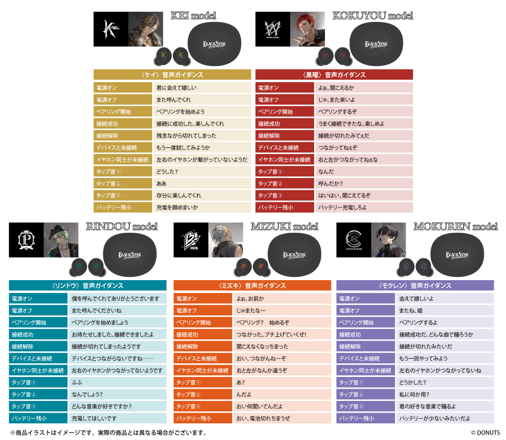 本コラボレーションモデルは、全5種類展開で「Team K」からケイ(CV:日野聡)、「Team W」から黒曜(CV:近藤隆)、「Team P」からリンドウ(CV:中島ヨシキ)、「Team B」からミズキ(CV:岡本信彦)、「Team C」からモクレン(CV: 斎賀みつき)のボイスは完全録り下ろしにてイヤホンに内蔵されます(全11ワード)。また本体は全種黒で統一、ゲームタイトルや各Teamのロゴを装飾しています。