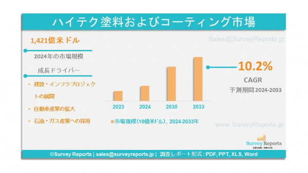 Surveyreportsのアナリストによる定性的なハイテク塗料およびコーティング市場分析によると、ハイテク塗料およびコーティングの市場規模は、建設およびインフラプロジェクトの開発、自動車産業の拡大、石油・ガス産業での採用、持続可能で環境にやさしいコーティングの需要の高まり、技術的進歩、業界固有のアプリケーションを要因として拡大するだろう。ハイテク塗料およびコーティング市場における主要企業の一部は、ヨトゥン, 日本ペイント, アクサルタ・コーティング・システムズ, アクゾノーベル, バルスパー, ヘンペル, ティックリラ, RPMインターナショナル, BASF, 関西ペイント, PPGインダストリーズ, ダウ, シャーウィン・ウィリアムズ, シーカAG, アルケマ