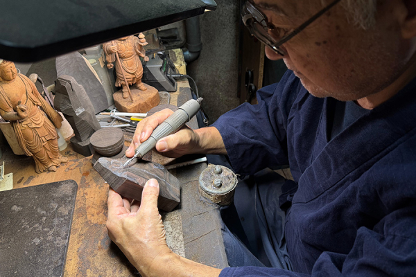 父の上原琉雲さんは、神戸で修行後、珊瑚職人から木彫職人になり、現在は長男の上原荘雲さんとふたりで行なっています。堅牢なため彫刻刀では削れず、歯科医が使うルーターを用いて少しずつ削り、製作しています。