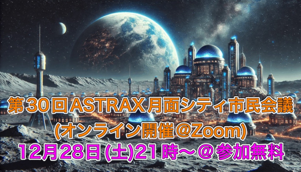 世界中の人々の夢を宇宙で実現させる民間宇宙サービスプラットフォームを提供する宇宙ベンチャー企業株式会社ASTRAX(アストラックス、以下 ASTRAX、本社:神奈川県鎌倉市、代表:代表取締役・民間宇宙飛行士 TAICHI(山崎大地))のグループメンバーが構成するASTRAX月面シティは、2024年12月28日に、ZOOMを使ったオンラインにて、第30回となるASTRAX月面シティ市民会議を開催しました。