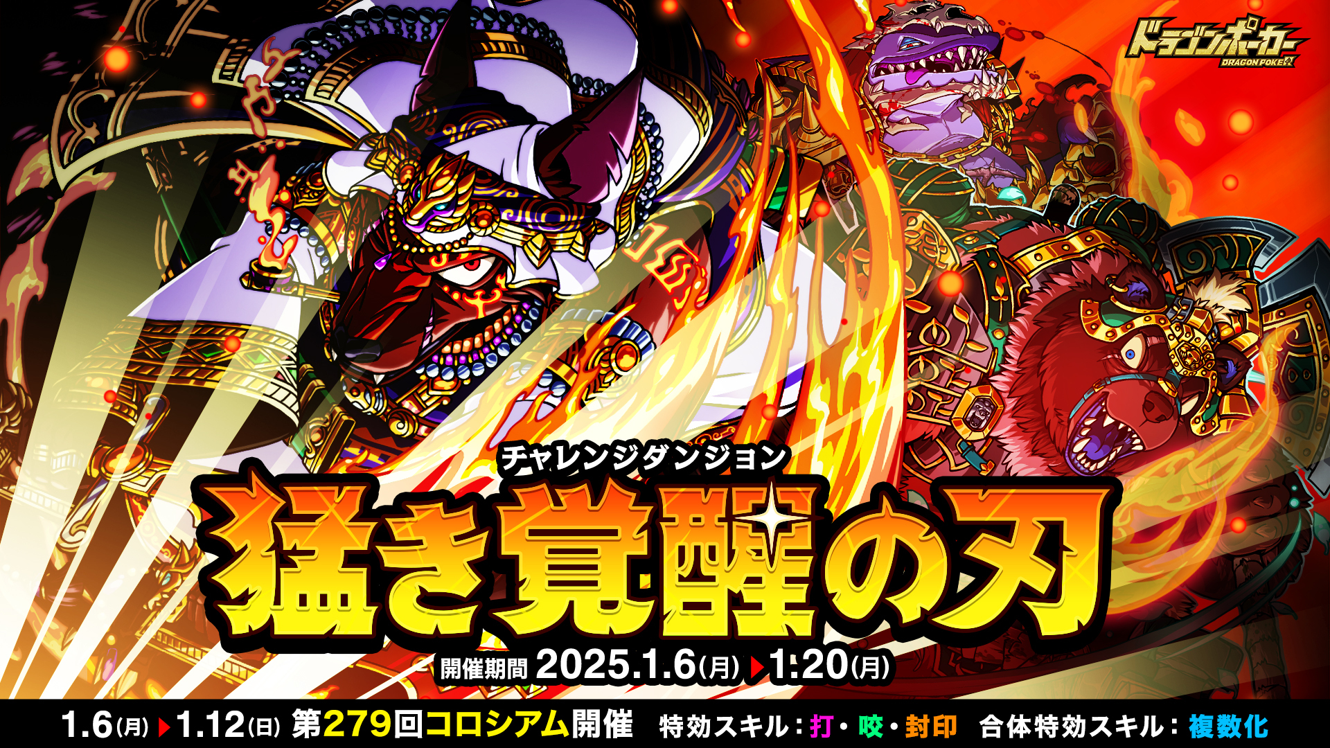 株式会社アソビズム(本社:東京都千代田区、代表取締役:大手智之)は、App Store・Google Playにて好評配信中のリアルタイム合体カードバトル『ドラゴンポーカー』で、2025年1月6日(月)よりチャレンジダンジョン「猛き覚醒の刃」を開催いたします。