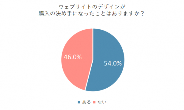 ウェブサイトのデザインが購入の決め手になったことがあるかどうかたずねたところ、全体の54%が「ある」と回答しました。半数以上の人が、ウェブサイトのデザインを重要な要因として認識していることがうかがえます。