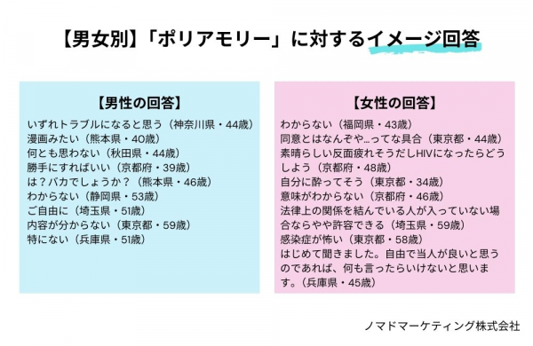 「理解できない」「自分には無理だと思う」など、ネガティブなイメージが大きく票を集めた一方で、「全員が幸せならいいと思う」「同意を得ているならいいと思う」と、当事者への理解を示す結果となりました。