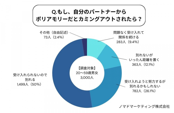 また、自分のパートナーがポリアモリーだったらどうするかという設問では、半数の人が「受け入れられないので別れる」と回答。自由記述回答では「他の人とは別れてもらう」という答えが多数寄せられたことからも、複数恋愛を受け入れる人は少数派であると言えます。
