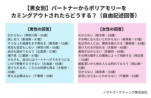 自由記述回答では、男女ともに多くの人が「わからない」と回答。ポリアモリーという恋愛スタイルが一般的ではなく、まだまだ知られていないことも理由の一つです。
