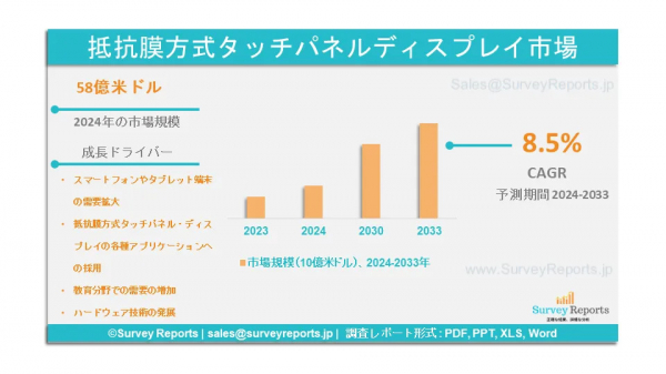Survey Reports LLCは、2025年1月に調査レポートを発行したと発表した。抵抗膜方式タッチパネルディスプレイ市場は、タイプ別(静電容量式タッチスクリーン、抵抗膜式タッチスクリーン、光学式、赤外線式タッチスクリーン、その他)、用途別( デジタルサイネージ、キオスク、家電、その他)、エンドユーザー別(住宅用、商業用、産業用、その他) - グローバル市場分析、動向、機会、予測、2024年から2033年)は、抵抗膜方式タッチパネルディスプレイ市場の予測評価を提供している。このレポートは、抵抗膜方式タッチパネルディスプレイ市場の成長促進要因、市場機会、課題、脅威など、いくつかの重要な市場力学を強調している。