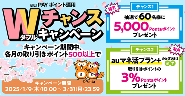 KDDI、auペイメントは2025年1月9日から3月31日まで、「au PAY ポイント運用」(注)のお好きなコースで月500ポイント以上取引いただいたお客さまのうち、毎月抽選で60名に5,000Pontaポイントがあたるキャンペーン(以下 本キャンペーン)を実施します。