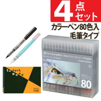 繊細な毛筆の穂先と、線描きに最適な細芯がひとつになったツインタイプのカラー筆ペン80色とスケッチブック、すぐに乾く筆ペン、塗りながらぼかし効果も演出できる水筆ペンがセットになりました♪