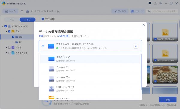 3.右下の「復元」をクリックし、復元したファイルの保存場所を選択し、例えばOneDriveまたはGoogle Driveなどのクラウドディスクに保存することを検討してください。