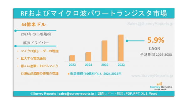 Surveyreportsの専門家はRFおよびマイクロ波パワートランジスタ市場の調査を分析し、2024年のRFおよびマイクロ波パワートランジスタ市場規模は64億米ドルに達すると予測した。さらに、RFおよびマイクロ波パワートランジスタ市場のシェアは、2033年末までに108億米ドルに達すると予測されている。RFおよびマイクロ波パワートランジスタ市場は、2024年から2033年の予測期間にわたって、年間平均成長率(CAGR)約5.9%で成長すると予測されている。