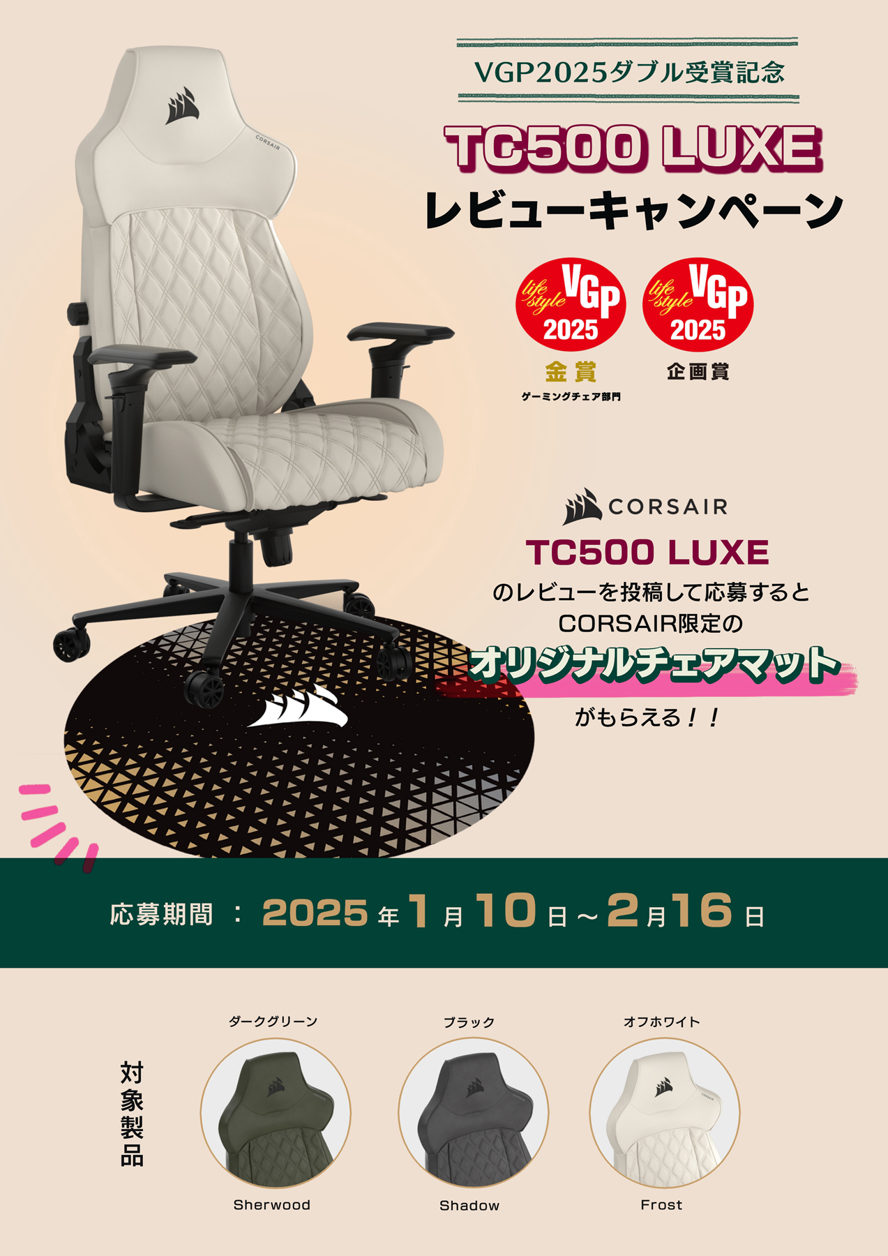 株式会社リンクスインターナショナル(本社:東京都千代田区、代表取締役:川島義之)は、CORSAIR製ゲーミングチェア「TC500 LUXE」のVGP2025ダブル受賞を記念して、期間中にレビュー投稿するとCORSAIR限定オリジナルチェアマットがもらえる「CORSAIR TC500 LUXE レビューキャンペーン」を2025年1月10日から2025年2月16日まで開催いたします。