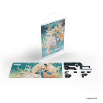 HYTE Songque Keycap Set + Mouse Padは、『崩壊3rd』とHYTEのコラボレーションで誕生した、限定デザインのキーキャップとマウスパッドのセットモデルです。キーキャップは「松雀(瞞天嬉遊・旭影)」をモチーフにしたアイコンを各所にあしらい、エメラルドグリーンと金色をベースに落ち着いた高級感のあるカラーリングを施しています。JIS配列に対応したキーの他、異なるアイコンを配置した置き換え用のキーも多数同梱。高耐久なPBT樹脂に摩耗に強い昇華印刷を使用しています。マウスパッドは900 mm幅のXLサイズ全面に松雀の描き下ろしイラストをプリントし、キーボードからマウスまでデスク全体をカバーすることが可能です。描き下ろしイラストのオリジナルタペストリーも付属。