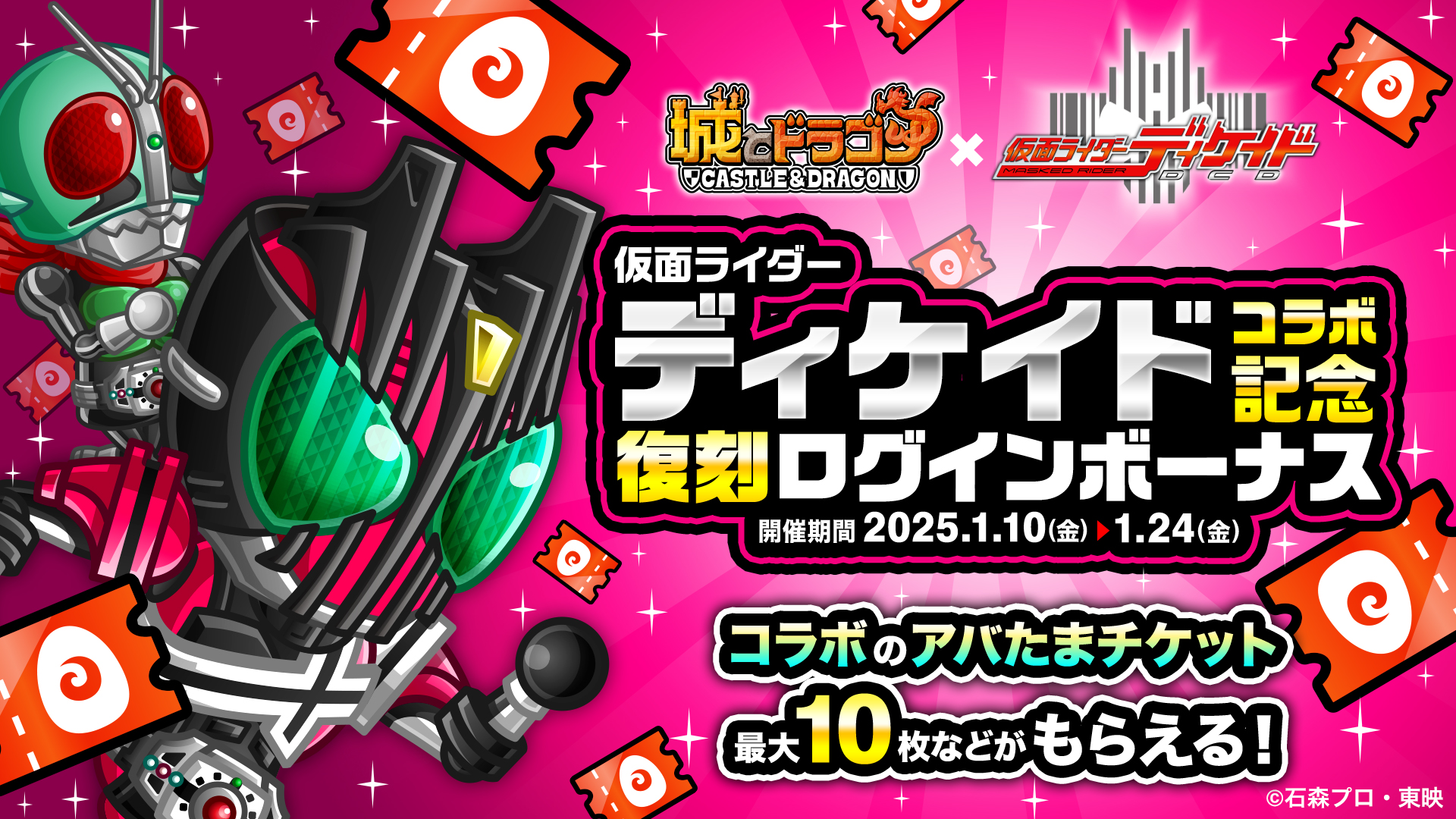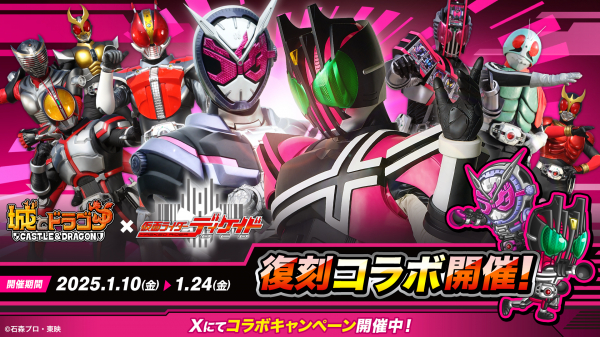 株式会社アソビズム(本社:東京都千代田区、代表取締役:大手智之)は、App Store・Google Playにて好評配信中の『城とドラゴン』で、『仮面ライダーディケイド』との復刻コラボイベントを、2025年
