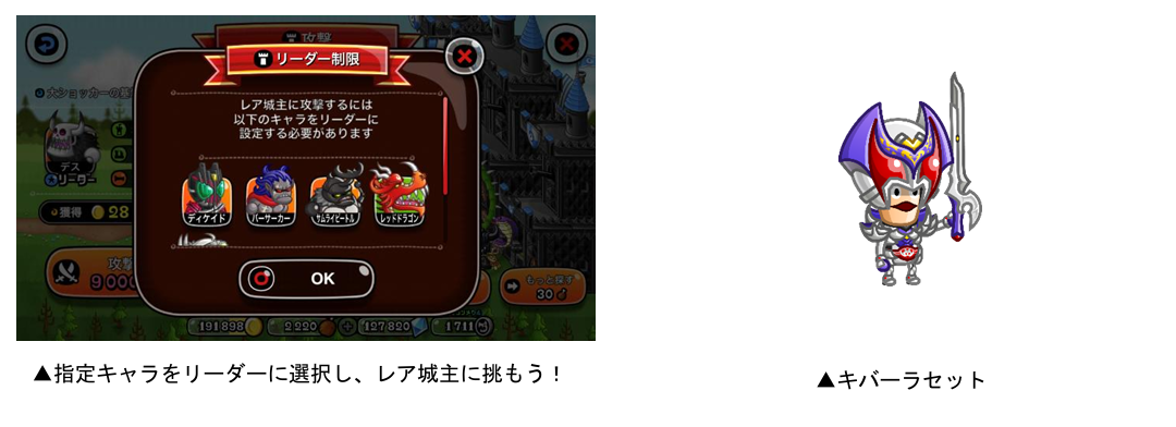 「バトル」から「ひとりで」または「みんなで」を選び、「攻撃」を選択すると、ランダムでレア城主が出現する「レア城主イベント」を開催いたします。まれに“戦闘員”に扮した剣士たちが現れ、規定数倒すと限定剣士お着替え「キバーラセット」がもらえます。