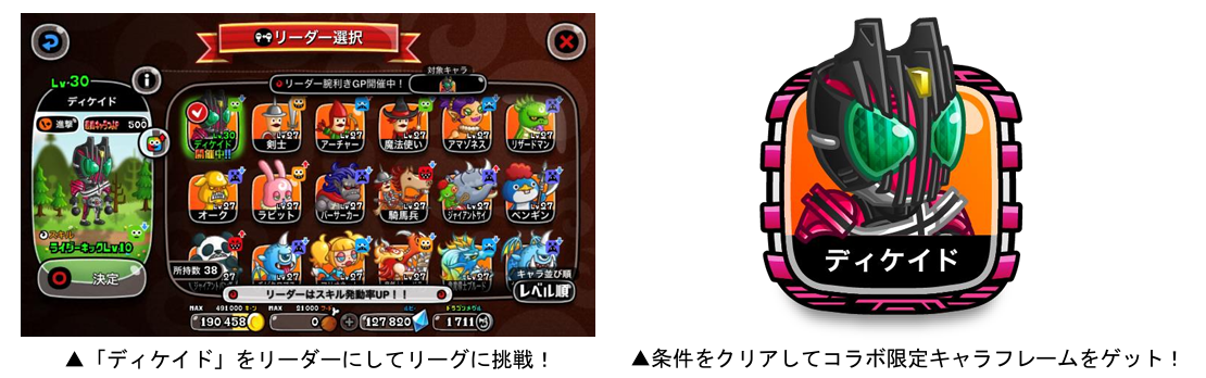 コラボ限定キャラ「ディケイド」をリーダーにしてリーグに挑む「リーダー腕利きGP」を開催いたします。バトルに勝利してより多くの「キャラフレP」を獲得したランキング上位者や条件を達成した方には、コラボ限定「キャラフレーム」が贈られます。