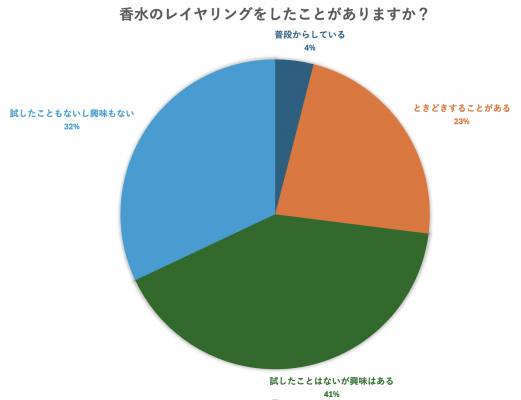実際にレイヤリングをしたことのある人は少数ですが、したことがないと回答した人の半数が興味を示しており、レイヤリングのコツやおすすめの香水など、そういった情報が広く提供されることで、レイヤリングを試してみる人が増えるのではないでしょうか。