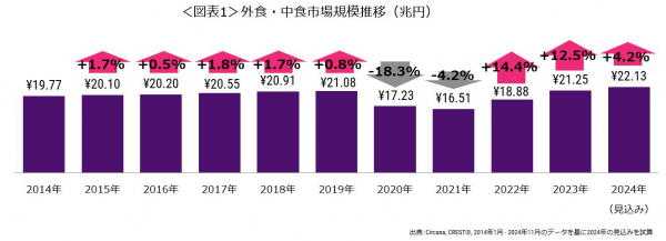 2024年1-12月計の外食・中食市場規模は、22.13兆円で、前年同期比4.2%増、コロナ前の2019年比5.0%増の見込みです(図表1)。調査を開始した2014年以降で最高規模となる見込みです。
