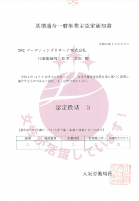この程、TPCマーケティングリサーチ株式会社(本社=大阪市西区、代表取締役社長=松本竜馬)は、2024年12月23日付で厚生労働省の「えるぼし」最高ランクである「3つ星」を取得しました。