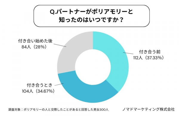 次に、ポリアモリーとの交際経験がある男女300人に、パートナーがポリアモリーとわかったのはいつのタイミングだったのかを聞きました。