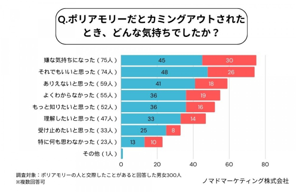 ポリアモリーのパートナーと交際経験があると回答した男女300人に、カミングアウトされたときのどう感じたかを聞きました。(複数回答可)