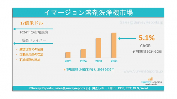 Surveyreportsの専門家は、液浸溶剤洗浄機市場の調査を分析し、2024年に生成された液浸溶剤洗浄機市場規模は17億米ドルに達すると予測した。さらに、液浸溶剤洗浄機市場のシェアは、2033年末までに27億米ドルに達すると予測されている。液浸溶剤洗浄機市場は、2024年から2033年の予測期間にわたって、年間平均成長率(CAGR)約5.1%で成長すると予測されている。